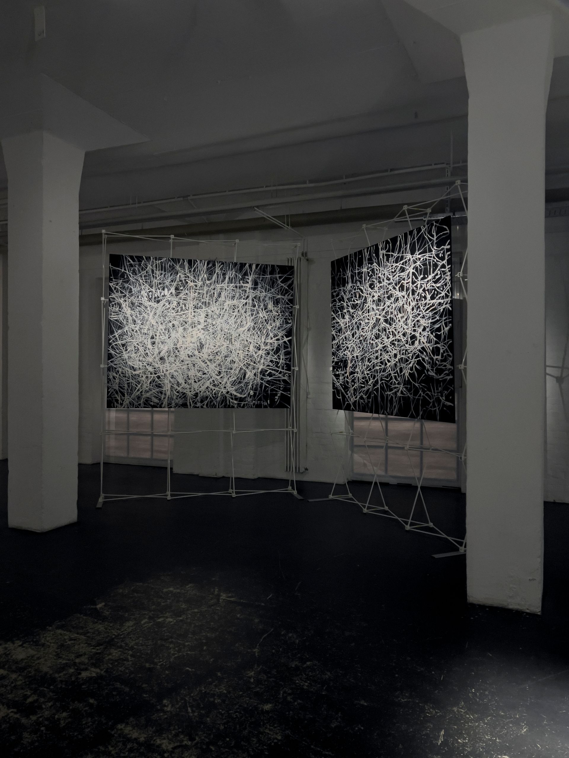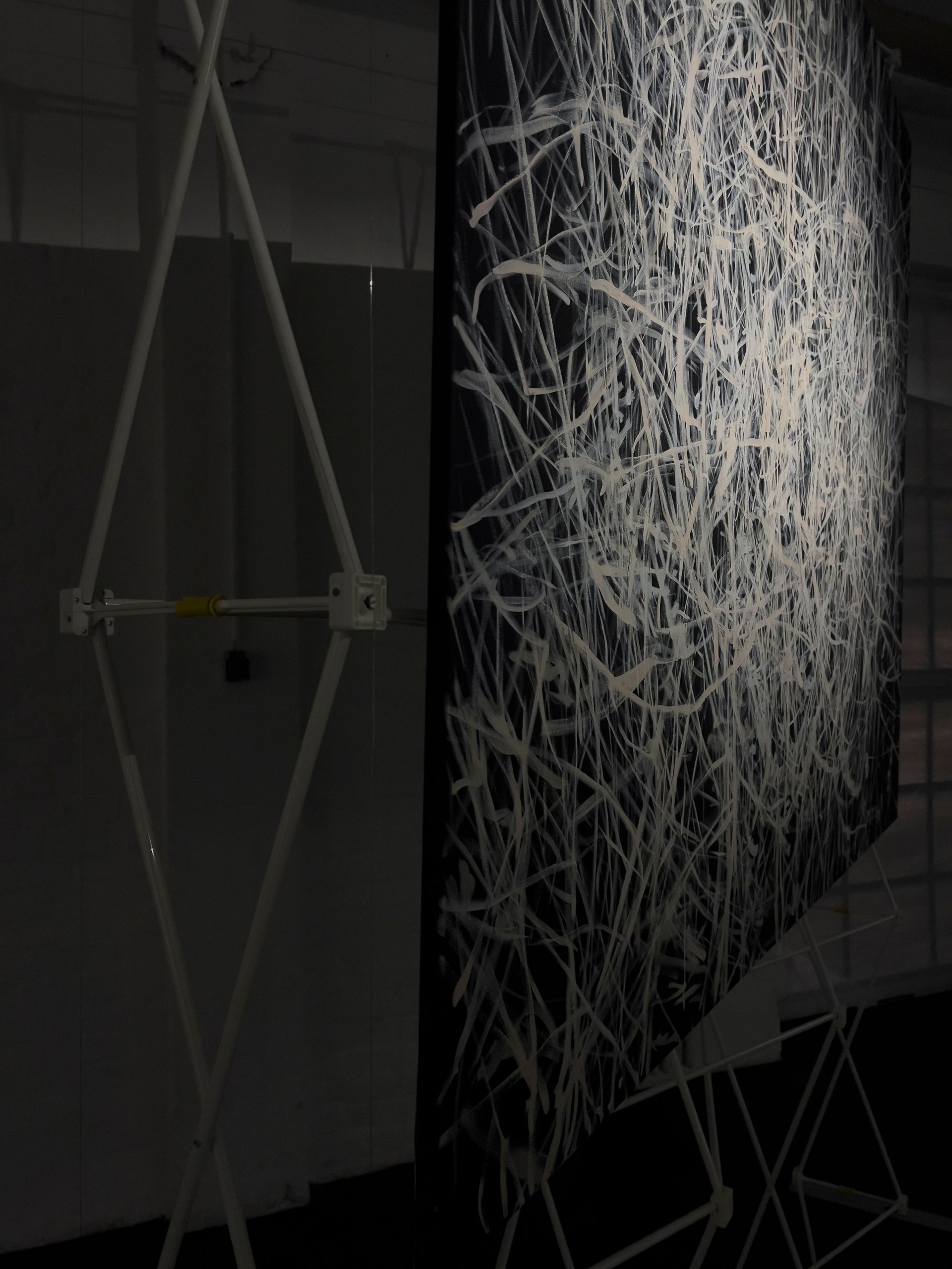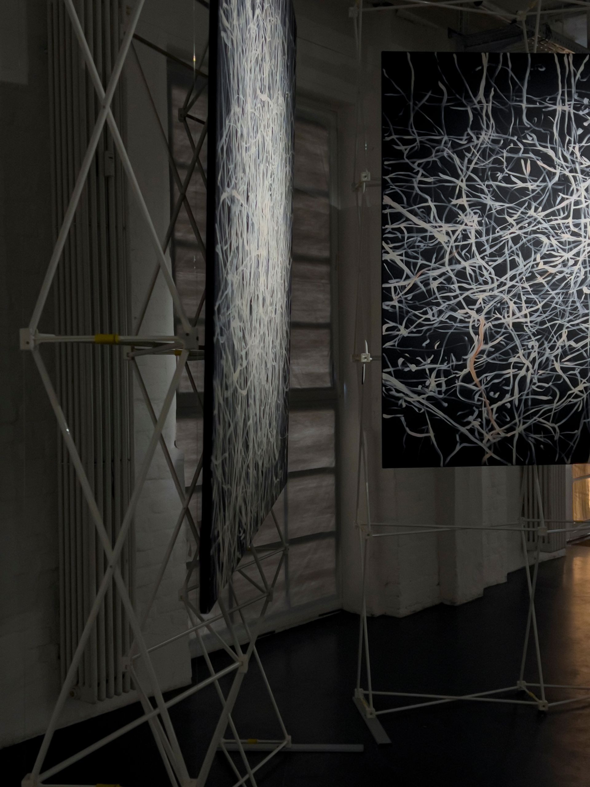 Mio Zając zeigt erstmals seine großformatige zweiteilige Arbeit „Gewalt oder Sex“. Dem aufmerksamen Blick erschließt sich die nuancierte Farbigkeit der Malerei in Öl auf Leinwand. Das Helldunkel ist nicht schwarz und weiß, sondern blau-grün-schwarz und gelb-rot-ocker-weiß. Zając eröffnet auf beiden Gemälden durch vielfach überlagernde, dynamische Linien Räume von unbestimmter Tiefe. Sie erinnern an die rätselhafte Schönheit von Bewegungsspuren der Himmelskörper im All auf langzeitbelichteten Teleskopfotografien.