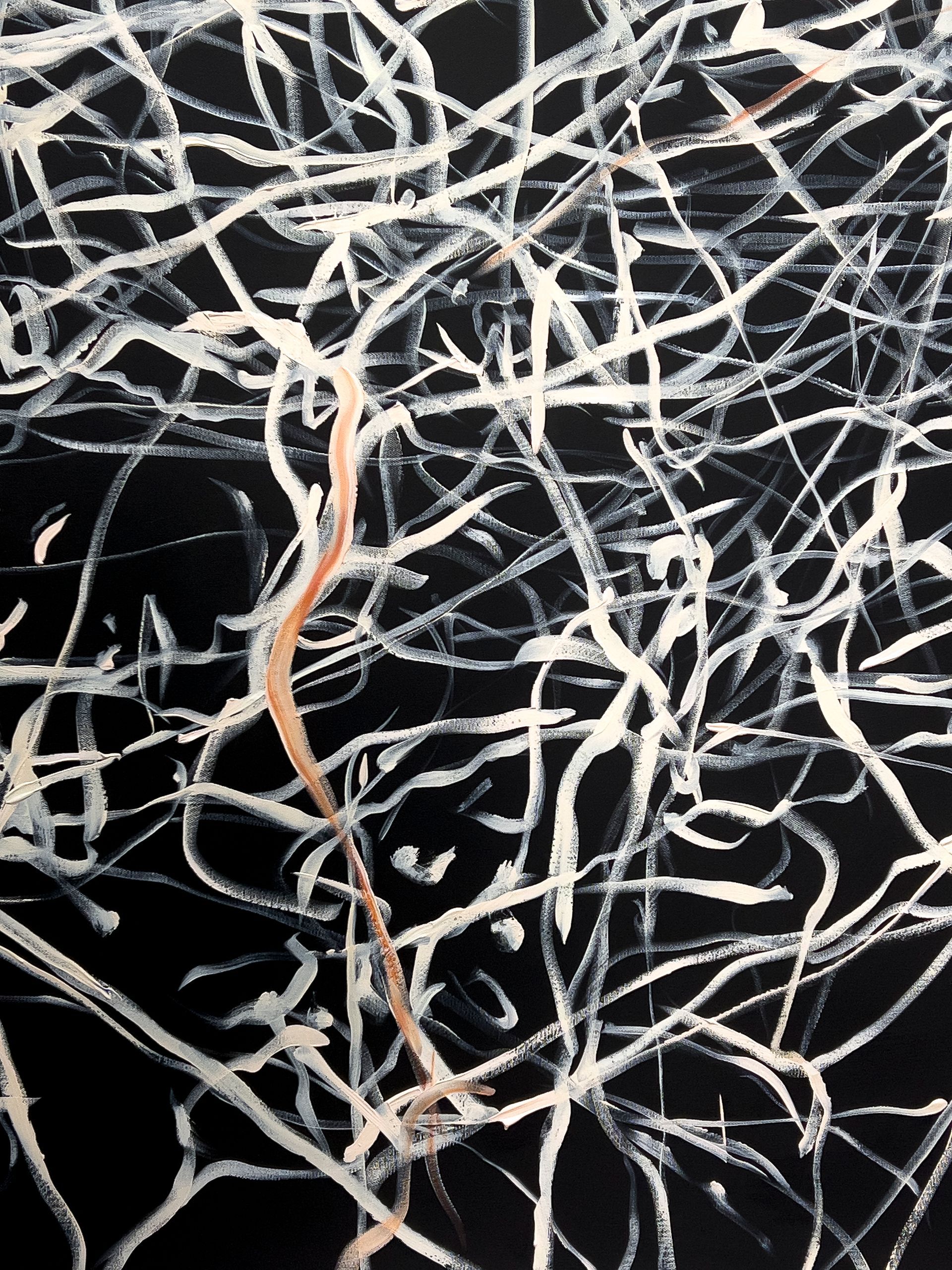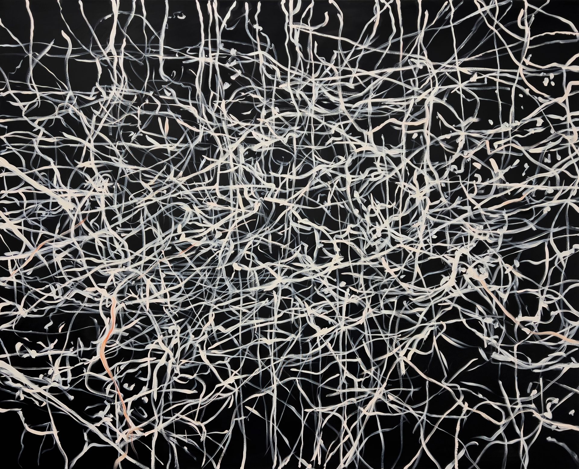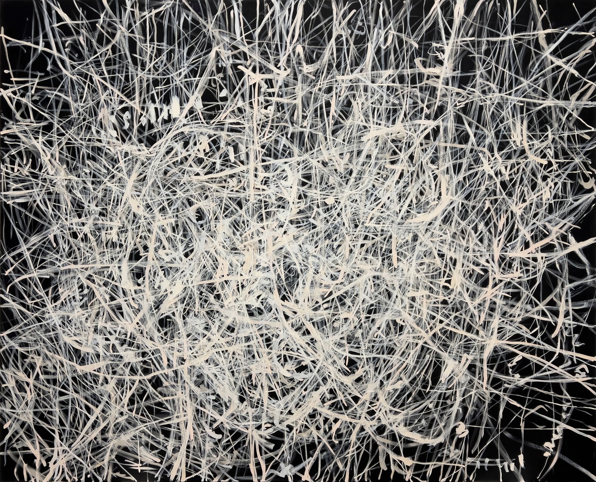 Mio Zając zeigt erstmals seine großformatige zweiteilige Arbeit „Gewalt oder Sex“. Dem aufmerksamen Blick erschließt sich die nuancierte Farbigkeit der Malerei in Öl auf Leinwand. Das Helldunkel ist nicht schwarz und weiß, sondern blau-grün-schwarz und gelb-rot-ocker-weiß. Zając eröffnet auf beiden Gemälden durch vielfach überlagernde, dynamische Linien Räume von unbestimmter Tiefe. Sie erinnern an die rätselhafte Schönheit von Bewegungsspuren der Himmelskörper im All auf langzeitbelichteten Teleskopfotografien.